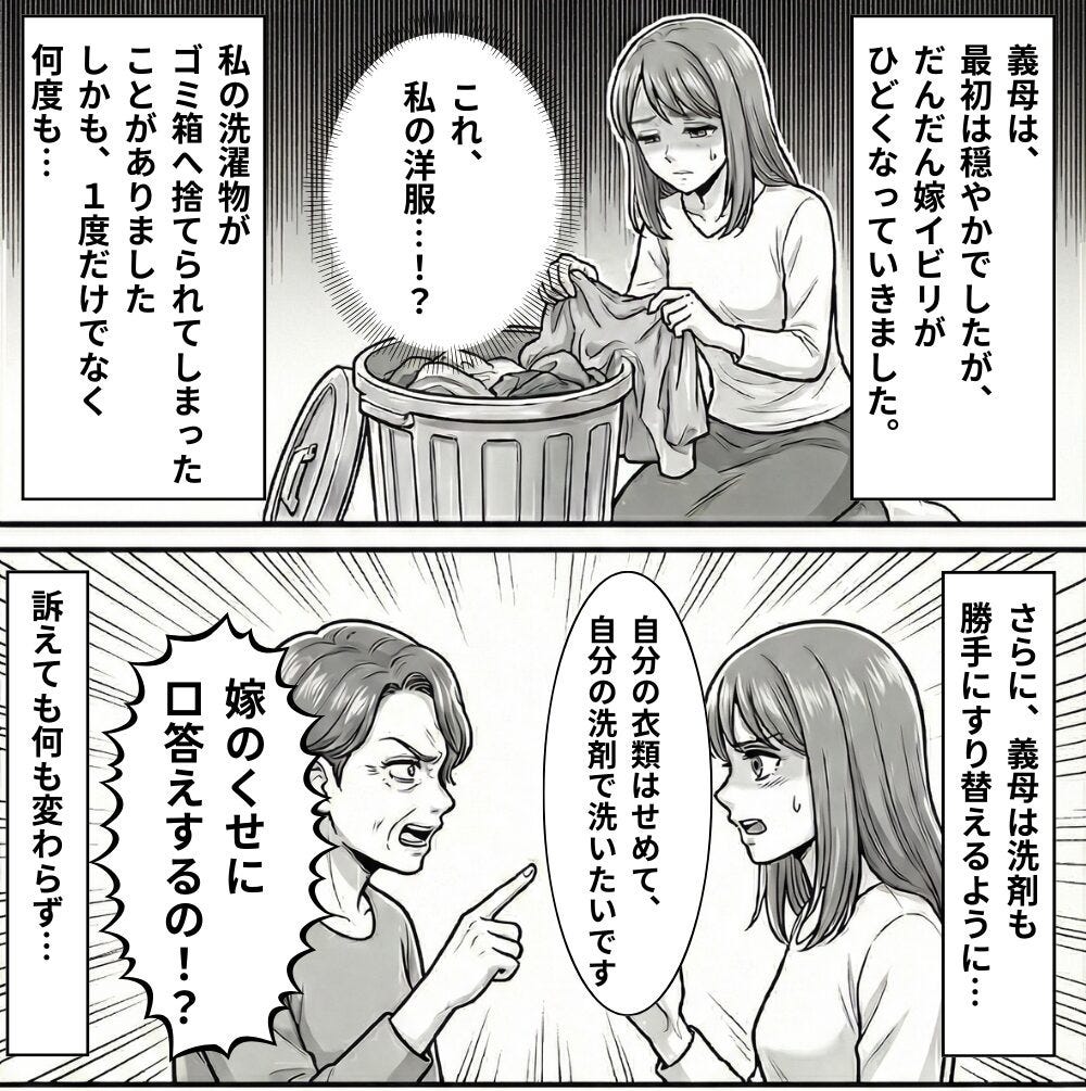 「自分の衣類はせめて、自分の洗剤で洗いたいです」と伝えても「嫁のくせに口答えするの?」と睨まれ、夫に相談しても「母さんはこだわりが強いだけ」と、真剣に取り合ってもらえませんでした。