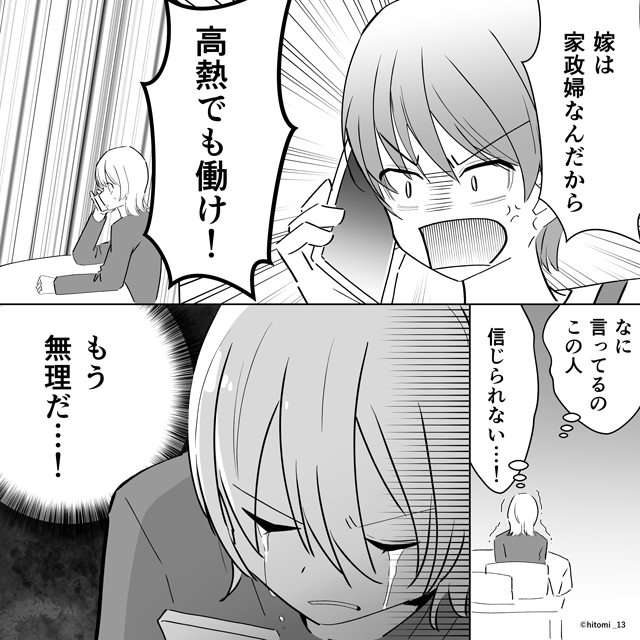 高熱で倒れているときにさえ、義母に「嫁は家政婦なんだから働け」と追い打ちをかけられる…。