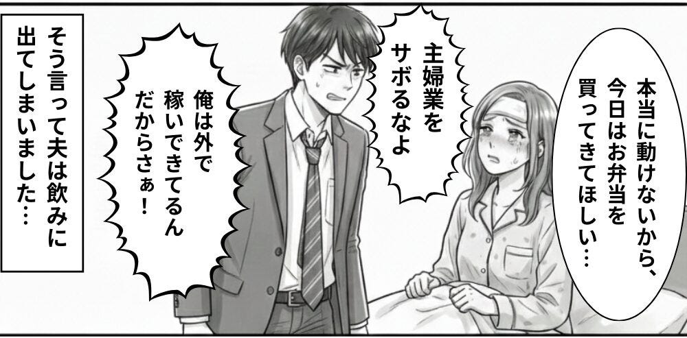 体調不良で体が思うように動かないとき、もっとも身近な夫から投げかけられる冷酷な言葉は、心に深い傷を残します。