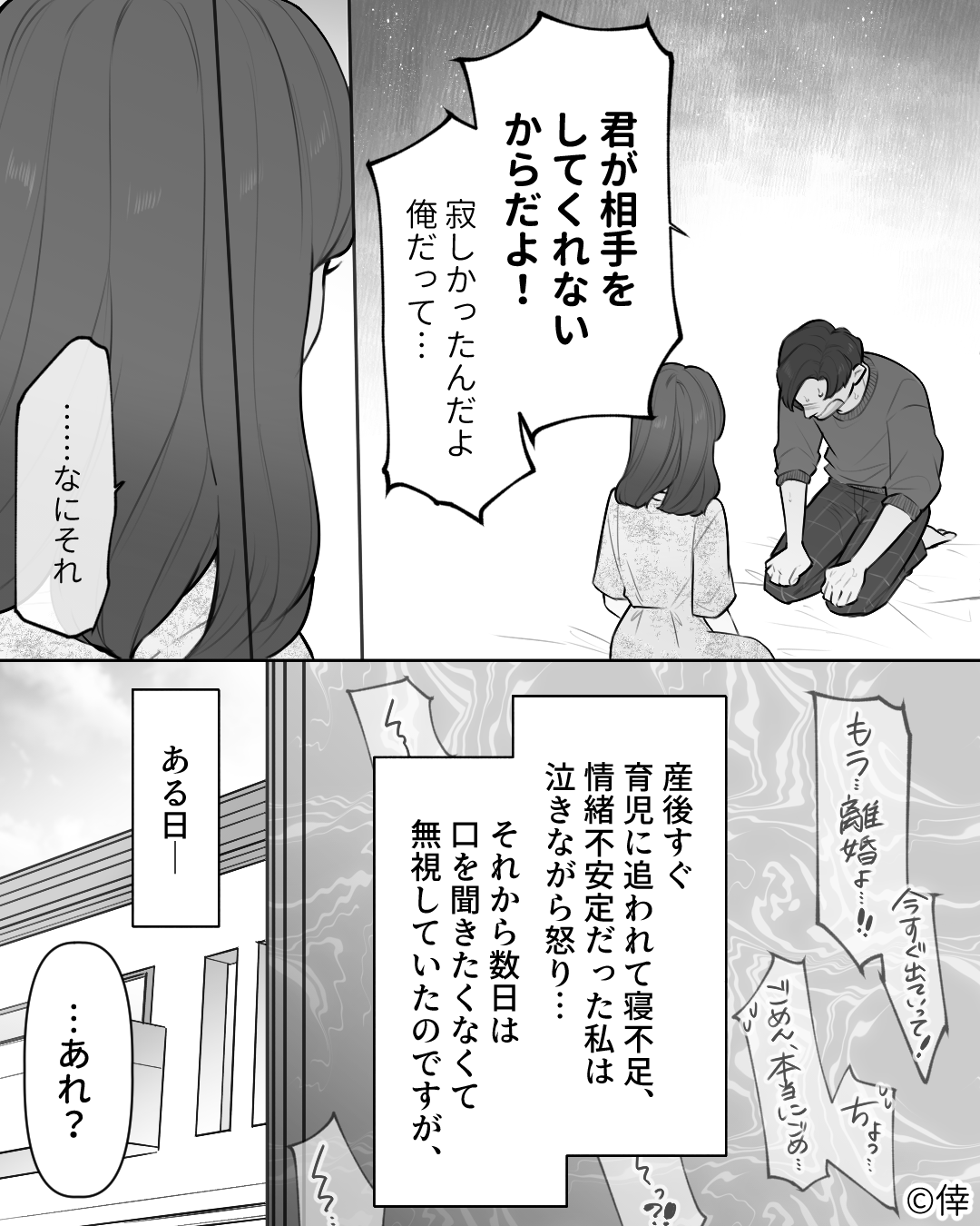 夫は「君が相手をしてくれないからだ」と、育児で精一杯な私に非があるかのように逆ギレ。