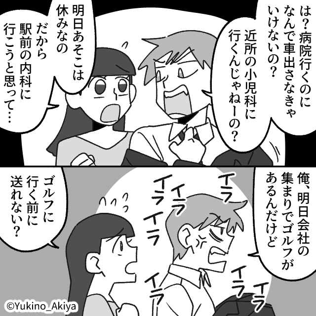 ただ、近所の小児科が休診日だったので、別の病院まで夫に車を出してほしいとお願いしたのです。