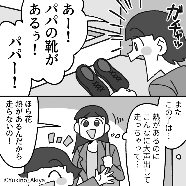夫が自宅にいることに気づいた娘は「パパの靴がある!パパー!」と大喜びで中へ走っていきます。