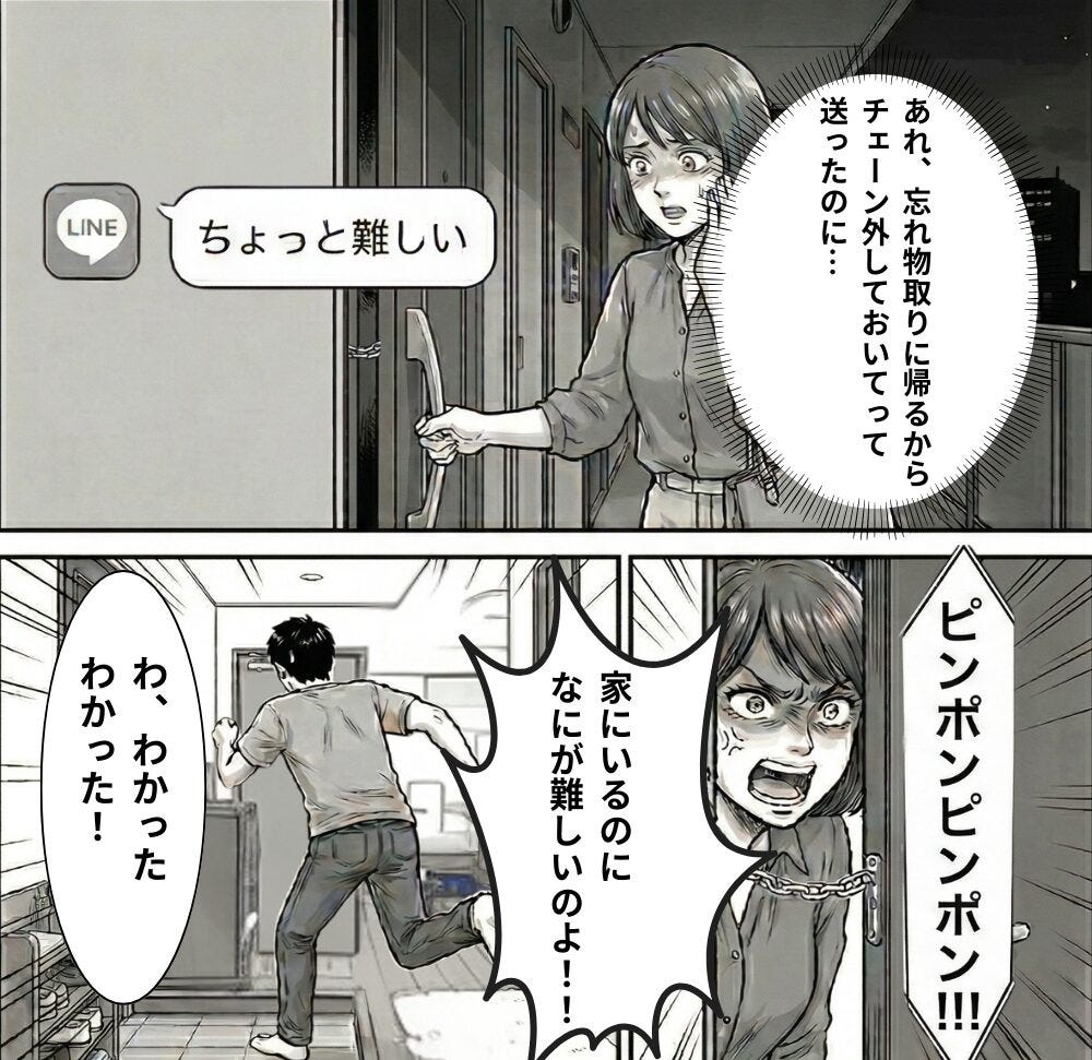 「女を家に連れ込んだのか」と頭に血が上り、インターホンを鳴らしてドアの隙間から叫ぶと、夫が出てきて渋々ドアを開けました。