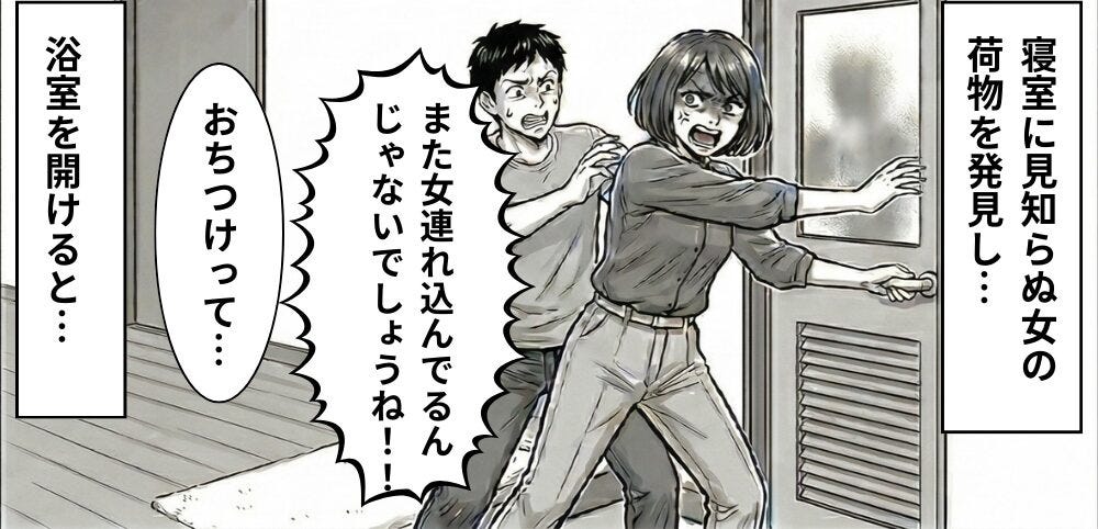 そして私が寝室へ入ると、女の荷物が置かれており、さらに浴室へ入るとそこには女の影が。