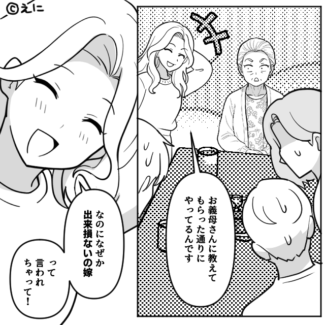 私は「お義母さんに教えてもらった通りにやってるんです。なのに出来損ないの嫁って言われちゃって!」と、明るく打ち明けたのです。