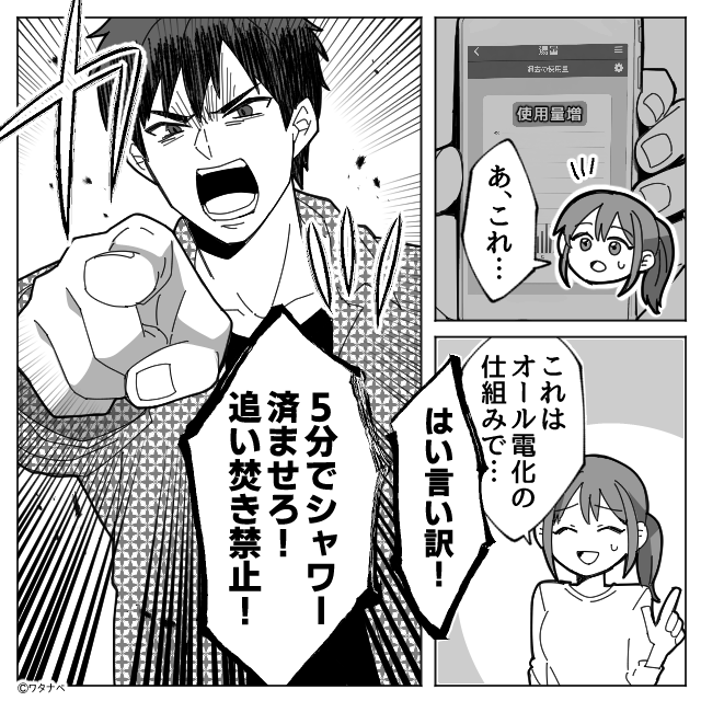 妻「オール電化だから…」夫「はい言い訳!」シャワーを【5分】に制限⇒後日、夫の面目丸潰れな話