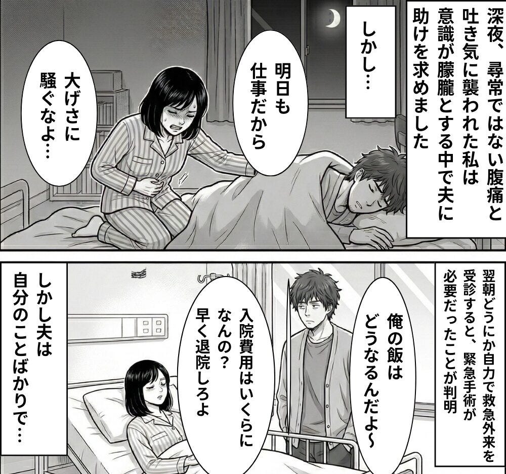 深夜、尋常ではない腹痛と吐き気に襲われた私は、意識が朦朧とする中で夫に助けを求めました。