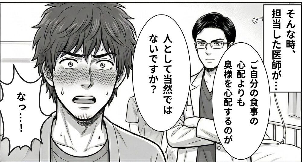そのとき、黙って聞いていた医師が「奥様は命を落としかけていました。ご自分の食事の心配より奥様を心配するのが人として当然ではないですか?」と夫を制したのです。