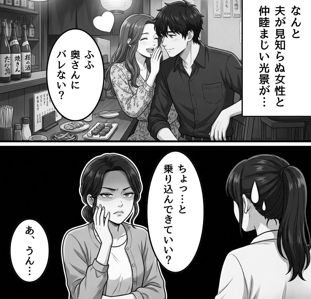 夫の浮気現場に居合わせたのは、会社の同僚との飲み会の帰りでした。