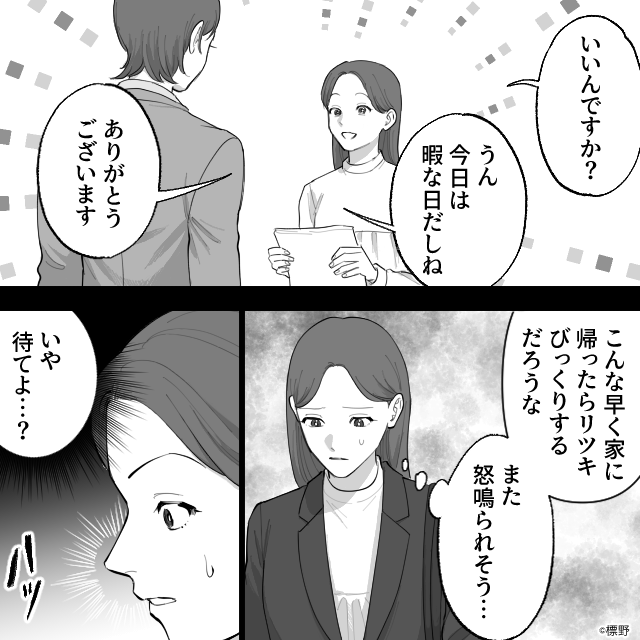 私は快く上司の申し出を受け入れたのですが…早く帰ると夫を驚かせてまた怒られるかもと考えました。