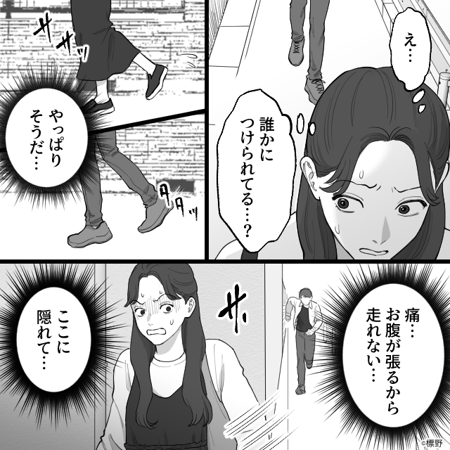 お腹に張りを感じ、思うように走れないもどかしさと恐怖に震えながら、私は必死に物陰に身を潜めました。