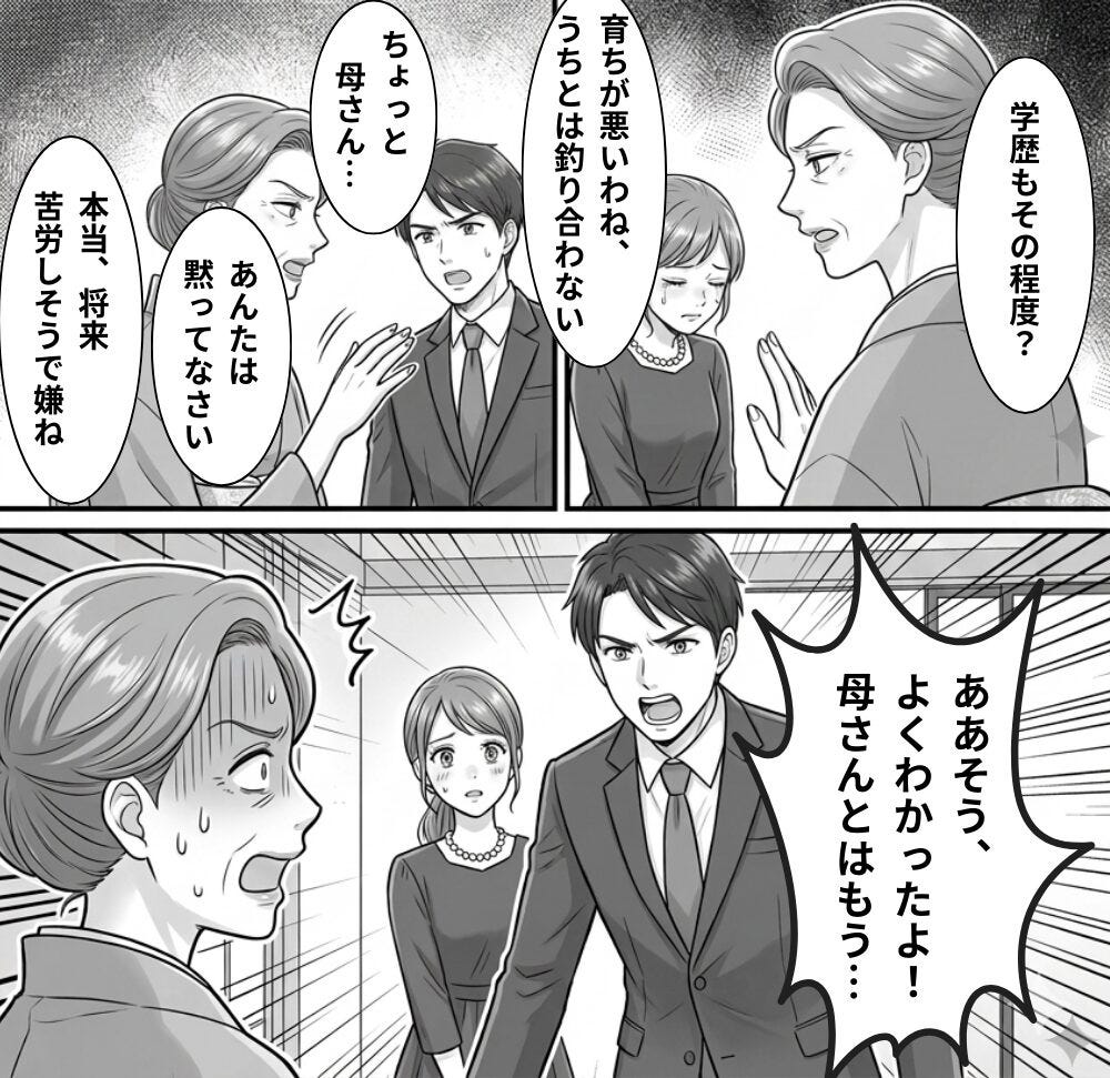 さらに学歴や職歴を掘り下げ「育ちが悪い、うちとは釣り合わない」「将来苦労しそうね」と言い、夫がフォローに入ろうとしても「黙ってなさい」と強い口調で遮ったのです。