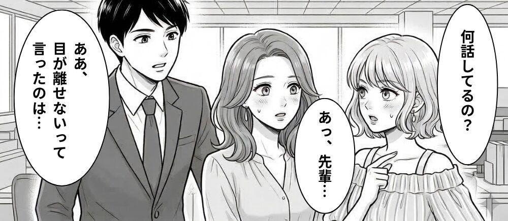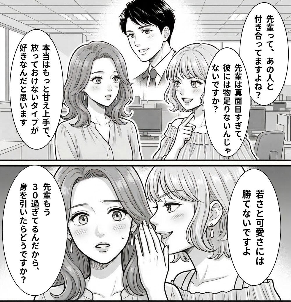 彼と同じ部署の女性社員は、私たちが社内恋愛中と知りながら、あからさまに彼を誘惑し、私にマウントを取ってくる厄介な存在でした。