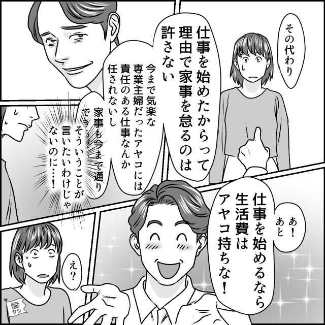 支え合うべき夫から「仕事をしてもいいけど、家事の手を抜くことは許さない」「生活費は全額負担しろ」と言われ、友達に会うことも禁止、良好な義母との仲まで引き裂こうとする――。