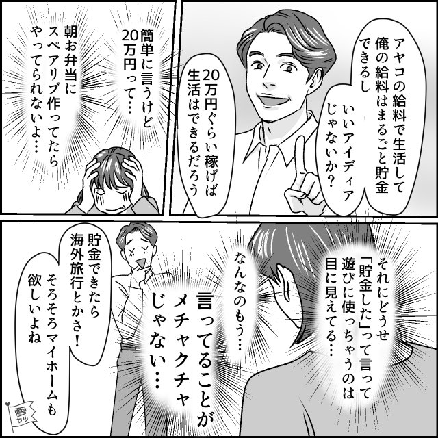 夫は楽しそうに理想を語りますが、実際は「貯金した」と言いつつ自分の遊びに使うに決まっています。