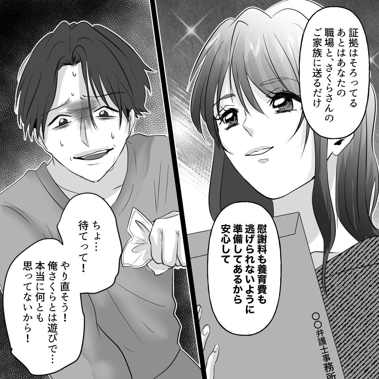 さらに弁護士事務所にも相談していた私は「慰謝料も養育費も逃げられないように準備してあるから安心して」と告げ、動揺して言い訳を並べる夫を突き放しました。