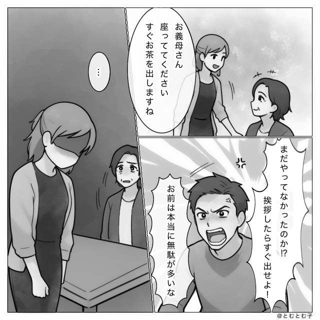 夫は義母に対しても高圧的な態度を取り、私にはお茶を早く出すよう怒鳴り散らしました。