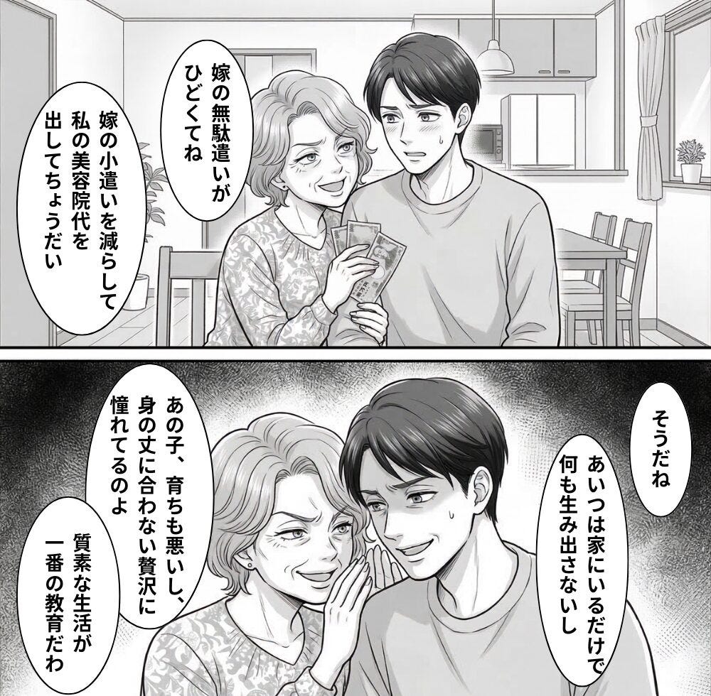 ある日、私がリビングに行くと義母が夫に「嫁が家計を圧迫してるから、今月のお小遣いを減らしてでも私の美容院代を出してちょうだい」と泣きついていました。