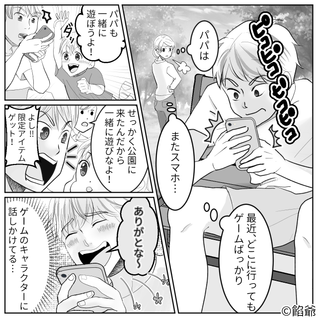 週末、家族3人で公園へ出かけましたが、夫は到着するなりスマホのゲームに夢中になってしまいました。