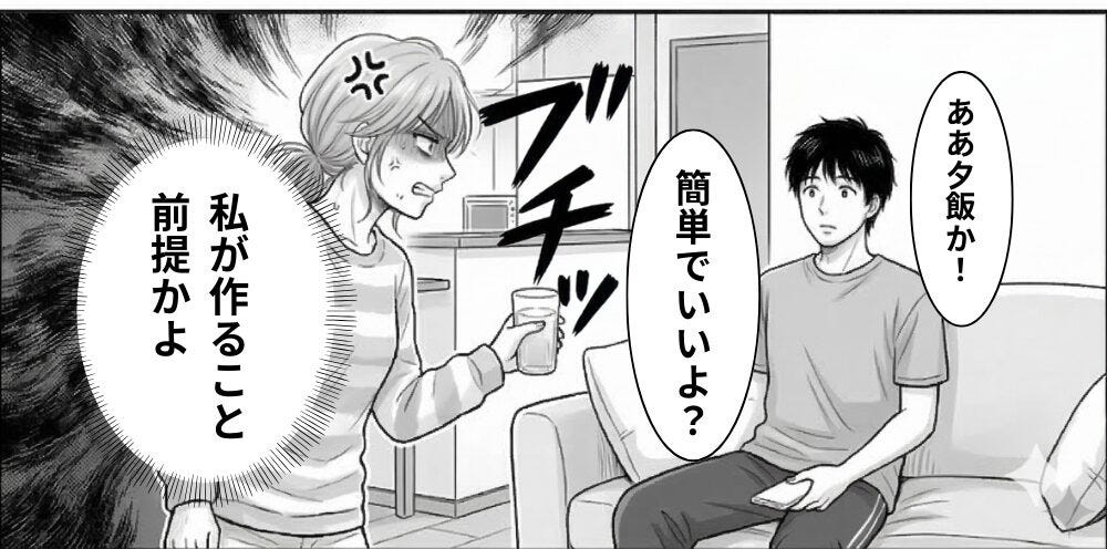 夫はテレビを見ながら「今日のご飯は簡単でいいよ?」と軽い口調で笑って言いました。