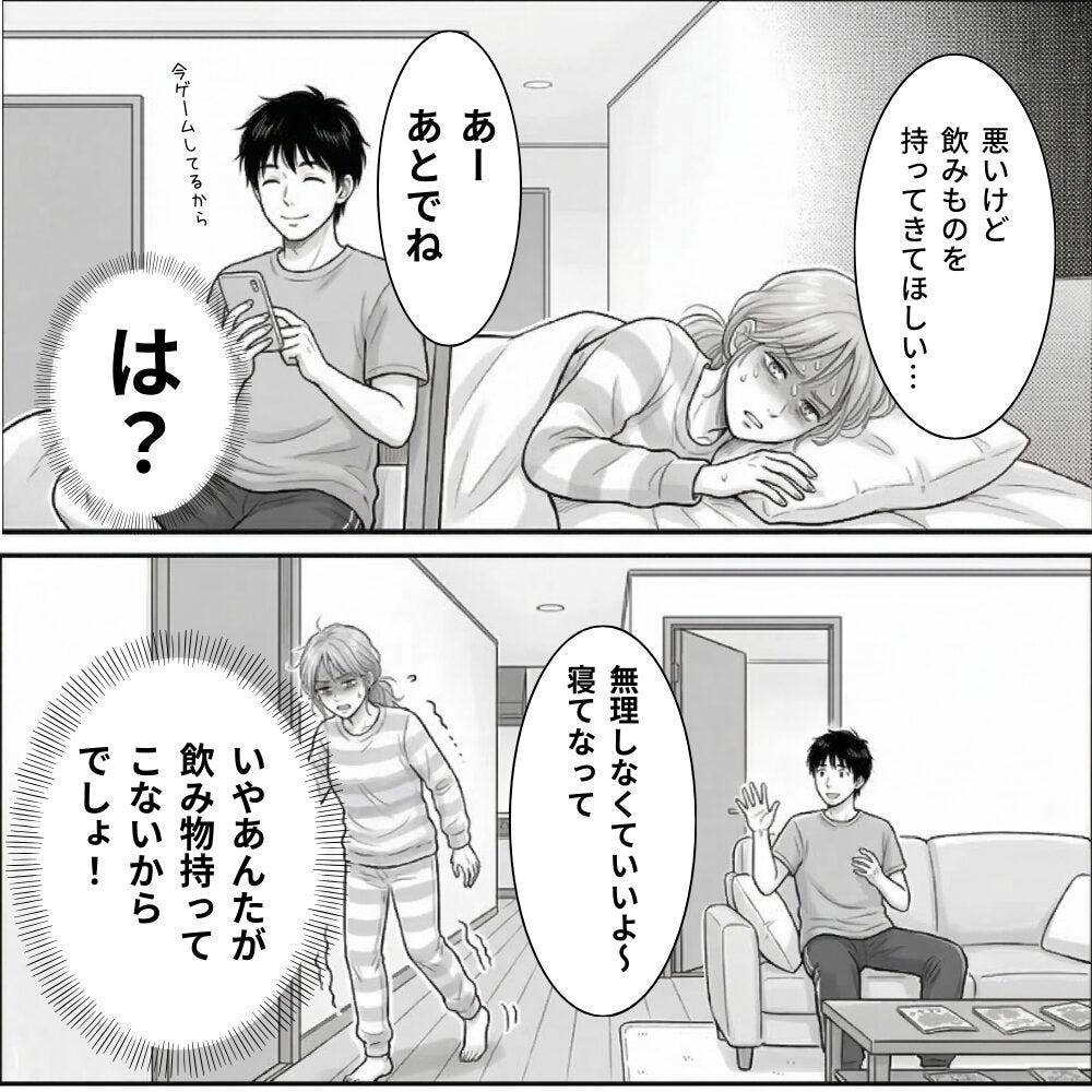 その瞬間、「は?夕飯私が作るの?高熱で頭も痛いのに?お前は?」と、体調のつらさよりも気持ちが一気に冷めたのを覚えています。