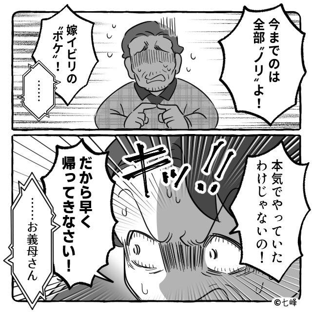 「今までのは全部ノリよ!嫁イビリのボケ!本気じゃないの、早く帰ってきなさい!」