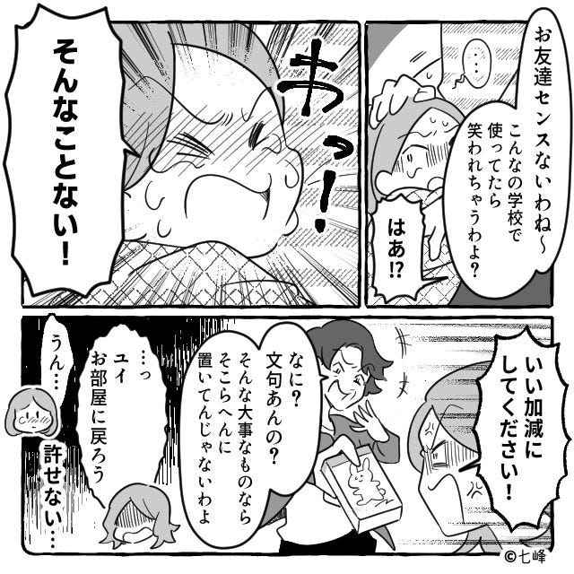 それを「ダサいプレゼント!」「友達もセンスないわね、こんなの使って笑われちゃうわよ?」と好き勝手言い、私が庇っても「なに?文句あんの?」と言って反省の色も見せず…。