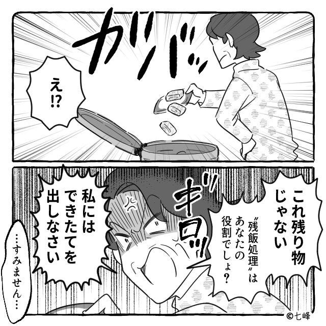 夕飯の残りを出したときは「残飯処理はあなたの役割でしょ?できたてを出しなさいよ!」と怒鳴られた始末…。