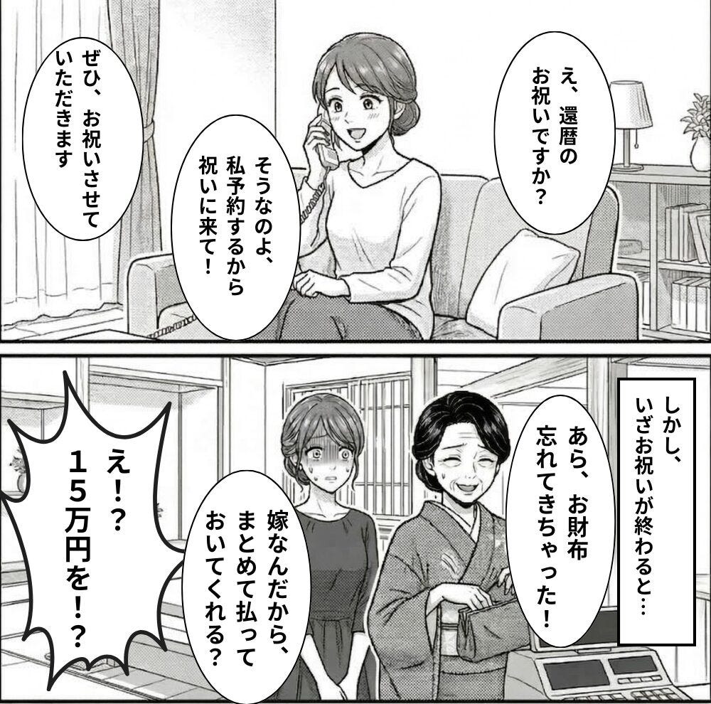 「あら、お財布を忘れてきちゃったみたい!あなた嫁なんだから、悪いけどまとめて払っておいてくれる?」と、10人近くいた親戚の前で大声で言い放ったのです。