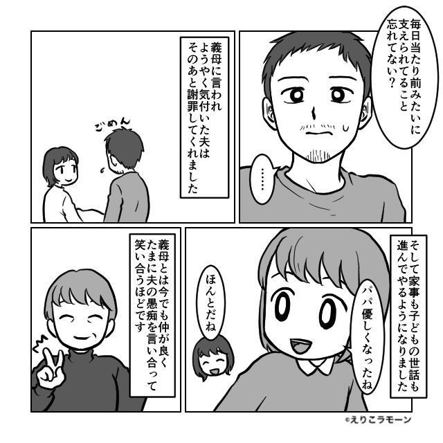 自分から伝えると角が立つ不満も、義母のような立場の人から諭してもらうことで、夫も素直に受け入れやすくなる場合があります。