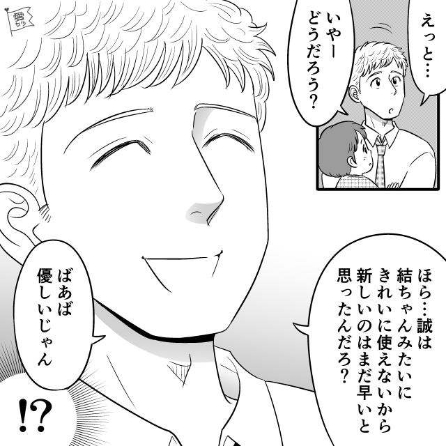 「息子はまだきれいに使えないから、新しいのはまだ早いと思ったんだろ?」「ばあば、優しいじゃん」