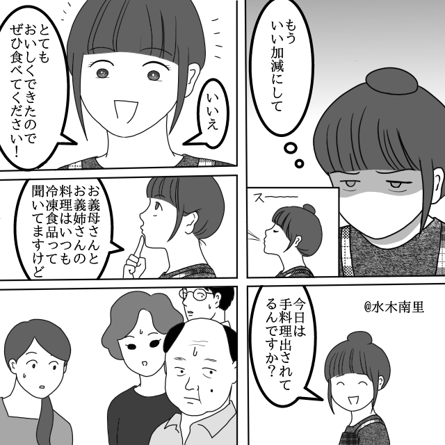 「お義母さんとお義姉さんはいつも冷凍食品だと聞いていますけど…今日は手料理を出されてるんですか?」と、笑顔で切り返したのです。