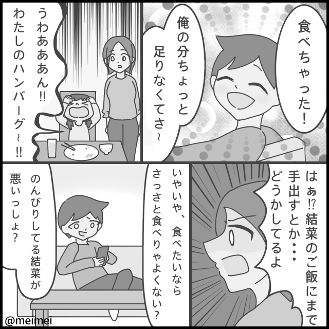 ある日、夫は娘の分のおかずまで食べてしまい、娘は大泣き。