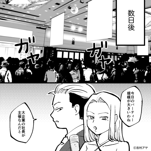 「今日のパーティは規模が大きいのね」「主催者は大企業の社長なんだと」