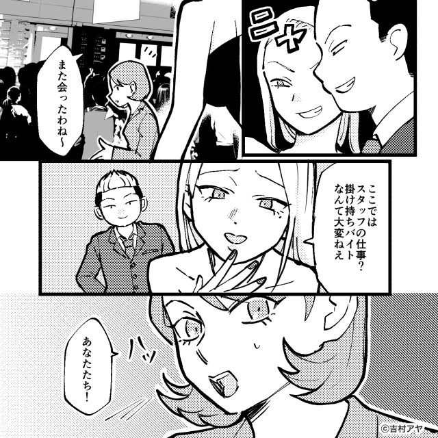 「あら、また会ったわね。ここではスタッフの仕事?掛け持ちバイトなんて大変ねえ」