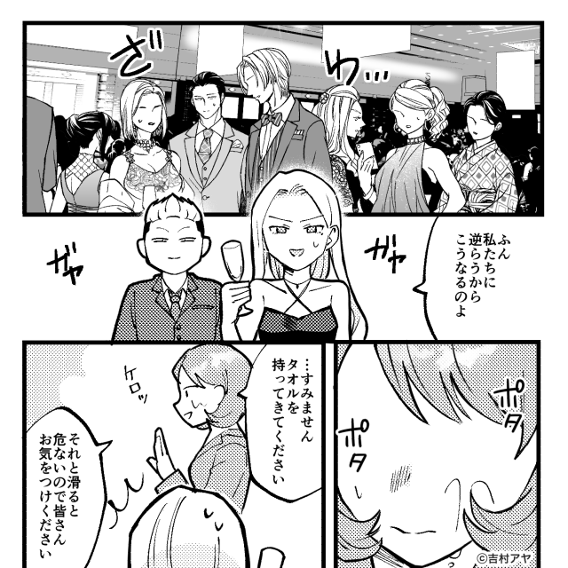 飲みものをかけられた女性の髪からは、ポタポタと雫が垂れます。