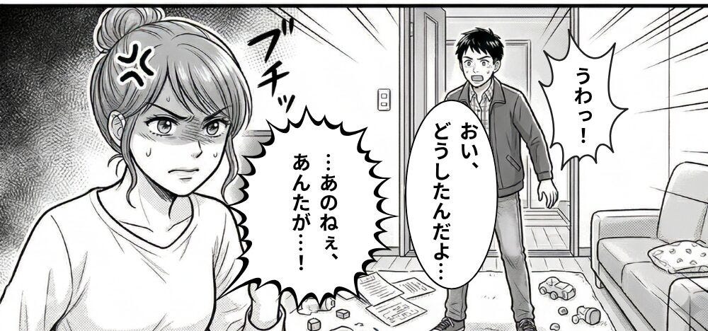 そして家事をすべて終えた夜、突然、どうして1人でこんなに頑張ってるのかわからなくなり、机の上にあった書類の山を、帰宅した夫のいるリビングに投げ散らかしてしまいました。