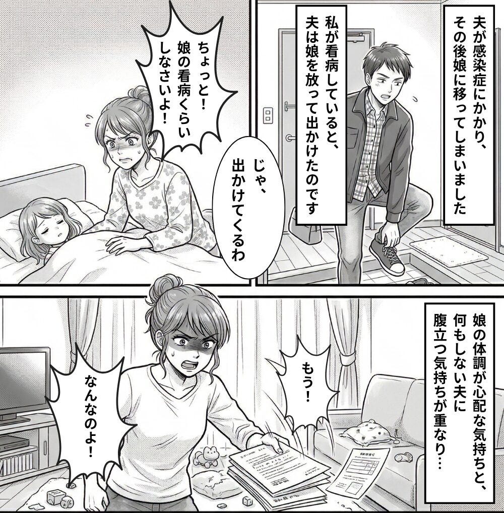 「抗体ができているのだから娘の看病をしてくれてもいいのに…」と思う私を横目に「高熱や咳に耐えて頑張ったから自由にさせてくれ」と平気で出かけてしまう夫。
