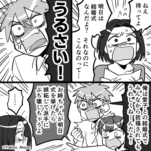 さらに妹まで「明日式を挙げたら、嫉妬して派手にぶち壊しちゃうよ」と脅してきます。