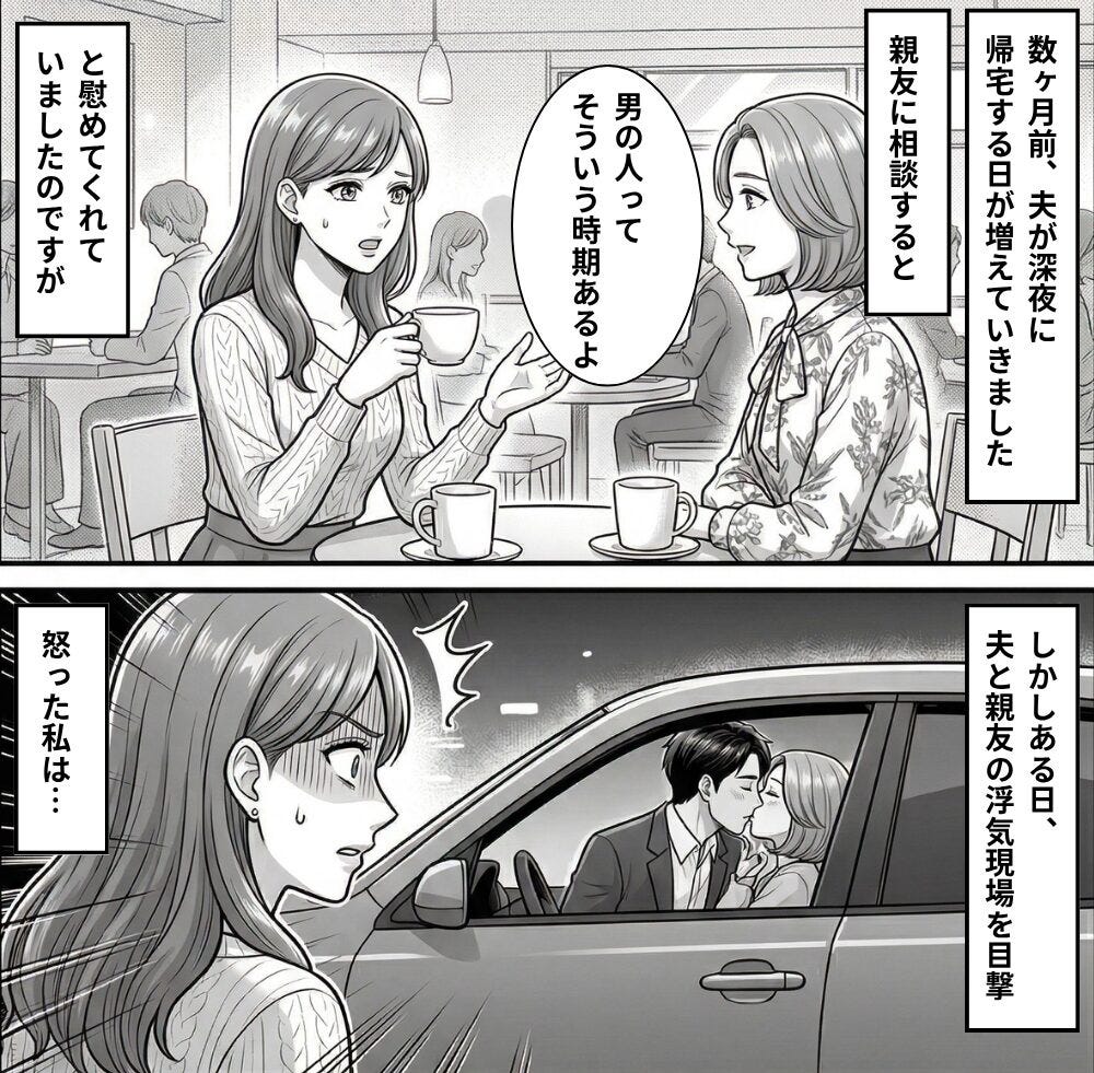 ある日の仕事帰り、夫がよく使う駐車場の近くを通ると夫の車がとまっており、助手席には…なんと親友が座っていたのです。