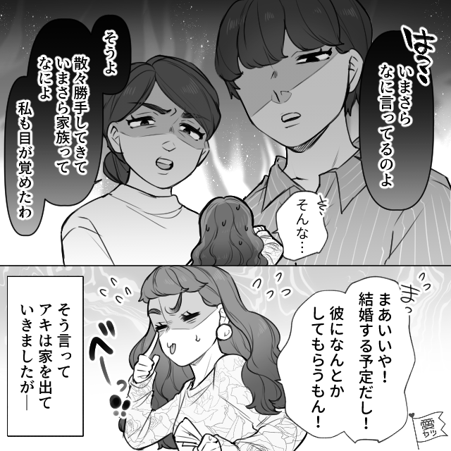 「散々勝手してきて、今さら家族だなんて…。私も目が覚めたわ」