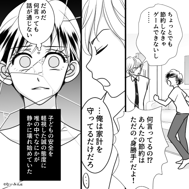 夫の極端な行動が原因とはいえ、娘を危険な目に合わせてしまった自分の不甲斐なさに涙が溢れました。 そして子供の安全を軽視する夫の態度に、「この人とはもう、一緒にいられないかもしれない」そんな思いが頭をよぎり、私の中で何かが静かに壊れ始めているのを感じました。