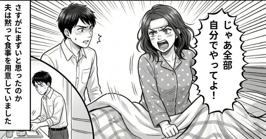 高熱で苦しむ妻に…「今日のご飯これだけ?」自分のご飯の心配しかしない夫。だが直後⇒「じゃあ…」妻がブチ切れた【結果】