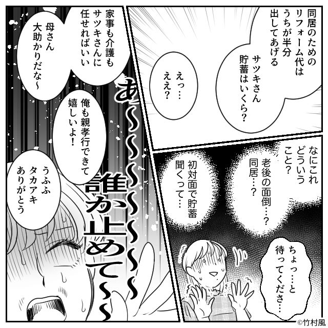 さらには、同居のためのリフォーム代は半分出す、貯金はいくらあるのか、など勝手に話が進んでいくばかり…。