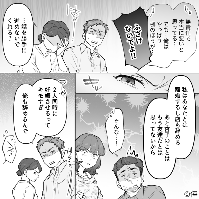 同席してくれた同僚も「2人同時に妊娠させるってキモすぎ」と言って去って行きました。