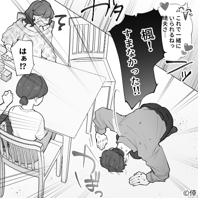 イスから転がるように落ちて、私に向けて勢いよく土下座したのです。