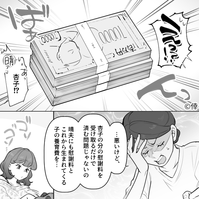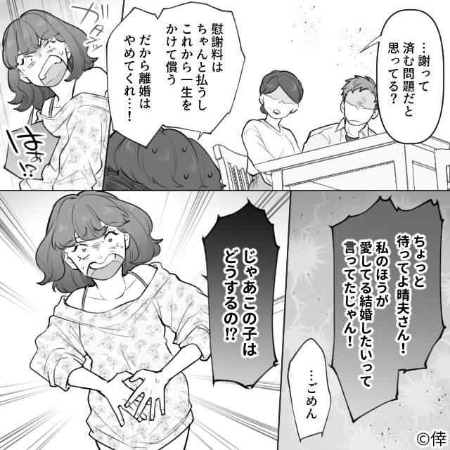 「あなたの分の慰謝料を受け取るだけで済む問題じゃないの。夫にも慰謝料と、これから生まれてくる子の養育費も…」