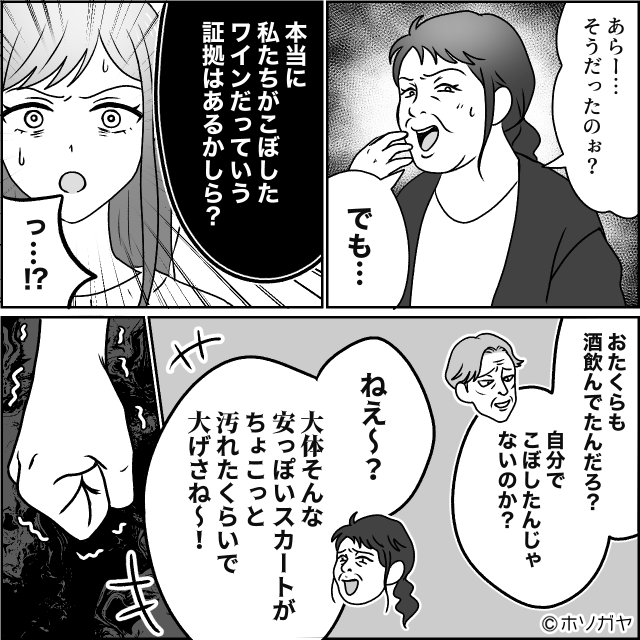 「そちらが先ほどこぼしたワインが、こちらのスカートにかかったんです。お気づきですよね?」