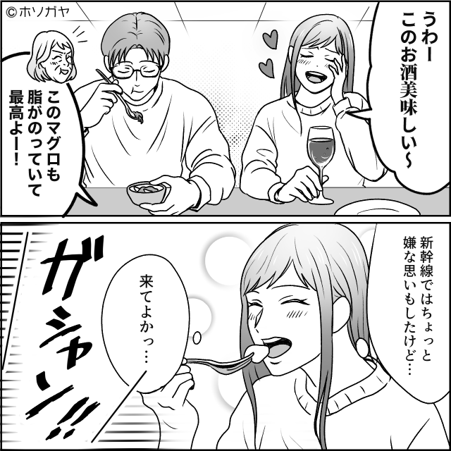 義両親と夫と旅行することになり、宿のレストランで食事をしていました。
