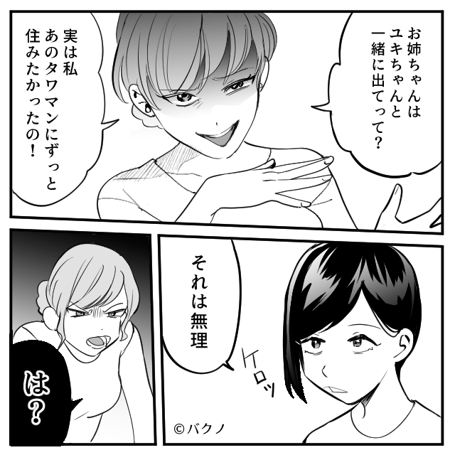 隣でオドオドしている夫も、妹に所有物扱いされていることに気づいていないのでしょうか。 妹はさらに「お姉ちゃん、タワマンから出ていってよ。私が住むから」と言い放ちました。 挙句の果てに「離婚すれば財産分与で半分は彼の、つまり私のものになるんだから」と勝ち誇った顔をしたのです。